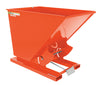 Uniform Capacity (pounds): 6,000, Steel (gauge): 8, Volume (cubic yards): 1–1/2, Fork Pocket Center (in.): 28, Usable Fork Pocket Width (in.): 7–1/2, Usable Fork Pocket Height (in.): 2–1/2, Usable Chute Width (in.): 40, Usable Chute Length (in.): 63–3/4, Usable Chute Height (in.): 41–1/2, Finish: Powder Coat Red – This Heavy Duty Self–Dumping Steel Hopper with Bumper Release automatically dumps when bumper release contacts the side of the dumpster. Hopper returns to an upright and locked position automatically after it dumps. Also includes a cable that may be operated from the seat of the fork truck to manually dump the hopper. A safety restraint is provided to secure the hopper to the fork truck. (Length Dimension is measured at top of chute.)