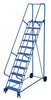 Roll-A-Fold Ladder, the portable ladder that conveniently folds for storage. Constructed of square tubing framework. Features removable hand railing, deep top platform, grip strut steps, and an industrial blue powder coat finish. Unit rolls around on large wheels. MFG Part# LAD-RAF-12-24-G