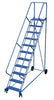 Roll-A-Fold Ladder, the portable ladder that conveniently folds for storage. Constructed of square tubing framework. Features removable hand railing, deep top platform, grip strut steps, and an industrial blue powder coat finish. Unit rolls around on large wheels. MFG Part# LAD-RAF-9-24-G-EZ