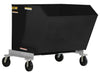 A portable steel Hopper makes handling waste and bulk material safer and more convenient. Fork truck entry openings are designed to move hopper over rough terrain. Foot operated caster lock is included. Unit tilts with assistance from operator while seated on fork truck. Handle for transporting. The included safety restraint should be properly secured to a fork truck before dumping. Welded construction makes them durable. Baked-in powder-coated toughness with galvanized base.