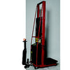 Model #: PESPL–80–2424. Platform is 24 inches by 24 inches. Leg ID/OD 15"/21". Load Center 15". Meets ASME B56.10 specifications. Remote control, floor lock, and safety screen are standard on all models. With a minimally charged battery, unit can be used while recharging. Easy to read illuminated battery status voltmeter at no extra cost! 12V DC battery or 110V AC units available. To order add AC to the end of the battery powered stacker part #. PESPL–80–2424 FRAME: 052629. Steel Construction. Weight Capacity: 1000 lbs. 5" Phenolic Wheels. 4" Phenolic Casters. Raised Height: 80", Lowered Height: 8". Handle Bars. Floor Lock: Yes. A discount is available for purchases of 10 or more items. Call contractor at 317–867–2911 for details.