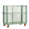 Heavy 12 gauge shelves are enclosed on 3 sides, 48" high above the deck in sturdy 1–1/2" angle iron corners and top trim. 2 swivel, 2 rigid 6" x 2" polyurethane casters with 3,600–lbs capacity. Mesh sides are 13 gauge flattened expanded metal. Comes with 3 shelves with a 15" clearance. Overall Height: 57". Deck Size: 30" x 48".
