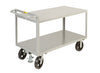 Constructed from all welded 1–1/16" tubing and 14 gauge channel formed steel. One shelf, with a deck height measuring 15." Maneuvers with 2 swivel, 2 rigid 5" x 1–1/4" polyurethane casters. Dimensions: 24" x 42" x 36". 1,000–lbs capacity. Optional floor locks and wheel locks available.
