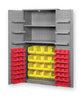 These cabinets are made from 14 gauge steel. Units have removable plastic bins with a front label holder for easy part identification. Doors are equipped with a keyed handle, two keys and a three point locking system. Comes with 170 bins and 4 cab shelves. Dimensions: 60"W x 24"D x 84"H. Options: Extra bins, steel door shelves, extra shelves, 6"H legs.