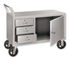Cabinet workbench measures 48"W x 24"D x 31"H with 6" casters. Complete with 14"W x 16"D x 5" high drawers with individual cylinder locks and hinged door with locking handle. Unit is equipped with an offset tubular push bar handle and 2 rigid, 2 swivel roller bearing mold–on rubber casters for easy maneuverability. 2,000–lbs Capacity. Optional floor lock available.