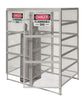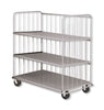 See–thru design for visual load inspection. The shelves are easily removed by sliding out of channels, permitting truck to be used for large materials. Consists of two sliding shelves and one fixed bottom shelf. Shelves slope 2" to the rear, 18" shelf clearance. Maneuvers on 2 swivel, 2 rigid 6" x 2" phenolic casters. Capacity: 2,000–lbs. Dimensions: 72"L x 36"W x 60"H. Optional floor lock or wheel brakes available.