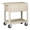 Easily handles the heaviest loads. Constructed of 12 gauge steel top box 6" deep with a 1" hammered edge. 2" bottom tray. Clearance between trays 17–3/4", floor clearance 6–1/2". Total Dimensions: 24"W x 36"L x 36"H. 3,000–lbs capacity. Options: Floor lock, flat bottom shelf.