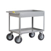 See–thru design for visual load inspection. The shelves are easily removed by sliding out of channels, permitting truck to be used for large materials. Consists of two sliding shelves and one fixed bottom shelf. Shelves slope 2" to the rear, 18" shelf clearance. Maneuvers on 2 swivel, 2 rigid 6" x 2" semi–steel casters. Capacity: 2,000–lbs. Dimensions: 48"L x 36"W x 60"H. Optional floor lock or wheel brakes available.