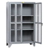 Diamond shaped perforated doors allow visibility to the contents inside while maintaining security and organization. Three point locking system with bright chrome locking handle. 14 gauge shelves adjust in 3-1/2" increments. Doors open 180 degrees allowing full access to the contents inside. Overall Height is 78" with 5-1/2" of underclearance to permit movement by pallet truck. Durable gray powder coated finish.