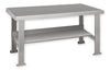 All models are constructed of 12 gauge steel tops & legs. 16 gauge stringers & shelves. The top, stringer & legs are reinforced for extra strength. Standard height is 32–1/2". All benches 96" or longer have additional center legs. Shelves are 15–1/4"D. Options: Adjustable legs, electrical knockouts, 34"H, drawer units, cylinder lock on drawers.