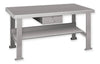 All models are constructed of 12 gauge steel tops & legs. 16 gauge stringers & shelves. The top, stringer & legs are reinforced for extra strength. No assembly is required. Standard height is 32–1/2. All benches 96" or longer have additional center legs. Shelves are 15–1/4"D. Drawer units are 14"W x 16"D x 5"H. Options: Adjustable legs, electrical knockouts, 34" height, cylinder lock on drawers.