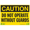 ZING Eco Safety Sign "CAUTION DO NOT OPERATE WITHOUT GUARDS" communicates critical messages that inform of designated areas and important safety precautions. Sign is made from durable high-impact recycled polystyrene self-adhesive that is resistant to solvents, moisture, scuffing and UV exposure as well as having high tear resistance. Recycled material is a minimum of 70% post-industrial and supports sustainability initiatives and LEED credits. Sign measures 7"H x 10"W. Made in the USA.
