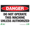 ZING Eco Safety Sign "DANGER DO NOT OPERATE WITHOUT SAFETY GLASSES" communicates critical messages that inform of designated areas and important safety precautions. Sign is made from high quality 70% post-consumer recycled plastic that is UL Validated for recycled content which substantiates material compliance with various green codes, standards, and procurement policies including the LEED Green Building Rating System, IgCC, GSA Advantage, ASHRAE 189.1 and others. Recycled material supports sustainability initiatives and LEED credits. Sign measures 10"H x 14"W and includes 4 mounting holes and adhesive tabs. Made in the USA.