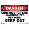 ZING Eco Safety Sign "DANGER CONSTRUCTION SITE KEEP OUT" communicates critical messages that inform of designated areas and important safety precautions. Sign is made from high quality 70% post-consumer recycled plastic that is UL Validated for recycled content which substantiates material compliance with various green codes, standards, and procurement policies including the LEED Green Building Rating System, IgCC, GSA Advantage, ASHRAE 189.1 and others. Recycled material supports sustainability initiatives and LEED credits. Sign measures 10"H x 14"W and includes 4 mounting holes and adhesive tabs. Made in the USA.