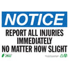 ZING Eco Safety Sign "NOTICE REPORT ALL INJURIES" communicates critical messages that inform of designated areas and important safety precautions. Sign is made from high quality 70% post-consumer recycled plastic that is UL Validated for recycled content which substantiates material compliance with various green codes, standards, and procurement policies including the LEED Green Building Rating System, IgCC, GSA Advantage, ASHRAE 189.1 and others. Recycled material supports sustainability initiatives and LEED credits. Sign measures 10"H x 14"W and includes 4 mounting holes and adhesive tabs. Made in the USA.