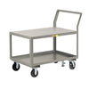This ergonomically designed utility cart features a kick-back style handle to ensure a safe and comfortable grip while reducing operator fatigue. The heavy-duty construction features fully-welded 12 gauge shelves. Rolls easily on 2 rigid, and 2 swivel casters. Available with your choice of 6†or 8" phenolic wheels. Available with flush edges or 1-1/2†retaining lip on the top shelf. 28†top shelf height. Available with wheel brakes on swivel casters or a floor lock to stop unwanted movement while loading and unloading.