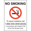 ZING No Smoking Sign "No Smoking - To report violations call" complies with Ohio No Smoking regulations and communicates important smoking policies to employees, customers and visitors. Sign is made from durable high-impact recycled polystyrene self-adhesive that is resistant to solvents, moisture, scuffing and UV exposure as well as having high tear resistance. Recycled material is a minimum of 70% post-industrial and supports sustainability initiatives and LEED credits. Sign measures 10"H x 7"W. Made in the USA.