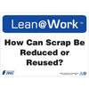 ZING Lean at Work Sign "How Can I Be Leaner Today" promotes Lean manufacturing and six sigma work practices in an eco-friendly way. Sign is made from high quality 70% post-consumer recycled plastic that is UL Validated for recycled content which substantiates material compliance with various green codes, standards, and procurement policies including the LEED Green Building Rating System, IgCC, GSA Advantage, ASHRAE 189.1 and others. Recycled materials support sustainability initiatives and LEED credits. Sign includes adhesive pads for easy mounting and measures 10"H x 14"W. Made in the USA.