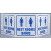 ZING Standard 3-Sided TriView Sign "REST ROOMS" communicates public messages with a 180-degree view that significantly increases visibility of information. Sign is made from high quality 70% post-consumer recycled plastic that is UL Validated for recycled content which substantiates material compliance with various green codes, standards, and procurement policies including the LEED Green Building Rating System, IgCC, GSA Advantage, ASHRAE 189.1 and others. Recycled material supports sustainability initiatives and LEED credits. Sign measures 7.5"H x 20"W, Projects 5 Inches and includes 2 mounting holes and adhesive tabs. Made in the USA.