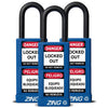 ZING RecycLock Padlock Set, keyed alike, include one key per padlock that can be used with other padlocks within the same set. Padlock features a solid aluminum body with fully insulated protective covering for increased safety and corrosion resistance. Precision 6-pin cylinder has key-retaining and auto-locking functions. Lock is made from high quality 70% recycled materials that is UL Validated for recycled content which substantiates material compliance with various green codes, standards, and procurement policies including the LEED Green Building Rating System, IgCC, GSA Advantage, ASHRAE 189.1 and others. Padlock contains no PVC and uses food industry approved lubricants. Lock body is blue with trilingual label and measures 1-3/4" Length x 1-1/2" Wide. Steel shackle measures 1-1/2" Length x 1/4" dia. 3 Padlocks per Set.