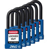 ZING RecycLock Padlock Set, keyed alike, include one key per padlock that can be used with other padlocks within the same set. Padlock features a solid aluminum body with fully insulated protective covering for increased safety and corrosion resistance. Precision 6-pin cylinder has key-retaining and auto-locking functions. Lock is made from high quality 70% recycled materials that is UL Validated for recycled content which substantiates material compliance with various green codes, standards, and procurement policies including the LEED Green Building Rating System, IgCC, GSA Advantage, ASHRAE 189.1 and others. Padlock contains no PVC and uses food industry approved lubricants. Lock body is blue with trilingual label and measures 3" Length x 1-1/2" Wide. Steel shackle measures 1-1/2" Length x 1/4" dia. 6 Padlocks per Set.