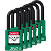ZING RecycLock Padlock Set, keyed alike, include one key per padlock that can be used with other padlocks within the same set. Padlock features a solid aluminum body with fully insulated protective covering for increased safety and corrosion resistance. Precision 6-pin cylinder has key-retaining and auto-locking functions. Lock is made from high quality 70% recycled materials that is UL Validated for recycled content which substantiates material compliance with various green codes, standards, and procurement policies including the LEED Green Building Rating System, IgCC, GSA Advantage, ASHRAE 189.1 and others. Padlock contains no PVC and uses food industry approved lubricants. Lock body is green with trilingual label and measures 3" Length x 1-1/2" Wide. Steel shackle measures 1-1/2" Length x 1/4" dia. 6 Padlocks per Set.